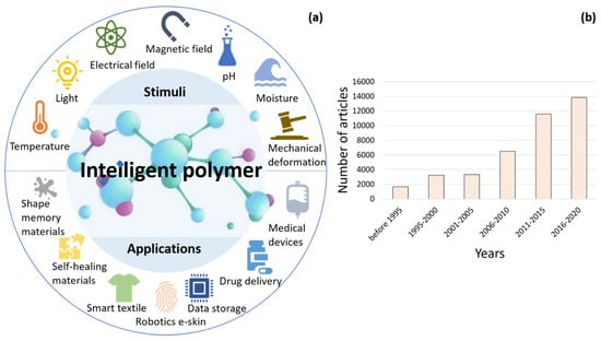 An overview of intelligent polymer development: (a) stimuli-responsive intelligent polymers and their diverse applications; (b) progress in intelligent polymer applications: an inclination in publications. Data derived from Scopus [24].