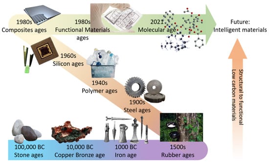 Keeping an eye on the increasing demands in developing and promoting smart materials in various types of applications in both academia and industry, polymer- and fiber-based materials are of the most interest [24]. With Figure 1b illustrating the trends of major progress and publications in intelligent polymers, the increasing amount of research works in several directions. Figure 2 shows the historical tendency of major engineering material systems to transition from structural to functional with a prospective future of low-carbon sustainable intelligent materials [25]. Major preoccupations have seen materials starting from Stone Age primitive materials and the rudimentary use of chemistry to treat natural rubber and metals, followed by electrochemistry in the last century, with numerous materials developed or discovered in between [26,27]. Nowadays, the wide use of polymers and ceramics makes industrial and daily-life products feasible, affordable and suitable for mass production [28,29,30]. Piezoelectric, semiconducting and thermoelectric materials are seen in many state-of-the-art applications [31,32,33,34] and intelligent devices based on their unique characteristics. Nevertheless, these materials still hold a certain level of limitations regarding the degree of intelligence, as most of them lack certain functionalities such as self-control, decision-making, self-learning or ease of recycling, which are critical to the demanding sophisticated modern way of life [25].
