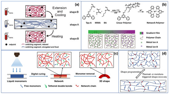 An overview on shape-memory intelligent polymers: (a) working mechanism of a thermoresponsive SMP [38,60]; (b) design and polymer-metal network synthesis [58]; (c) schematic illustration of the digital-light-printed SMP (Reprinted with permission from Zhang, Y.; Huang, L.; Song, H.; Ni, C.; Wu, J.; Zhao, Q.; Xie, T. 4D Printing of a Digital Shape Memory Polymer With Tunable High Performance. ACS Appl. Mater. Interfaces 2019, 11 (35), 32408–32413, Copyright American Chemical Society) [54]; (d) thermal- and humidity-triggered response of zwitterionic SMP [61].
