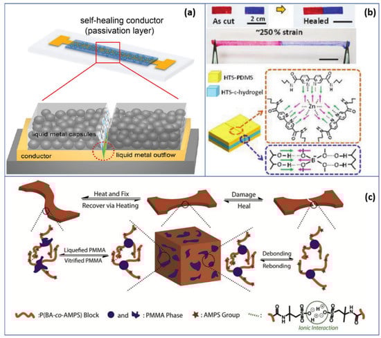 Mechanical stimuli, such as stress, strain and twist, cause changes in the form of polymers, and some polymers show recovering properties to transfer back to their previous defined shapes [79,80,81]. Compared with metals and ceramics, these polymers are easier to process at lower costs [82,83]. The self-healing ability of a polymer is obtained either extrinsically (from the polymer structure), or intrinsically (from the material molecular chain) [84]. Extrinsic healing comprises the majority of cases, in which healing compounds are stored in capsules or nanoparticles isolated from the polymer matrix. Otherwise, intrinsic self-healing polymers utilize the mobility of molecule chains by rearranging their configuration. Either way, the original functions, such as electrical conductivity, integrity of the surface structure or other mechanical properties of the material, are restored [85], which is where the term “self-healing” comes from.
