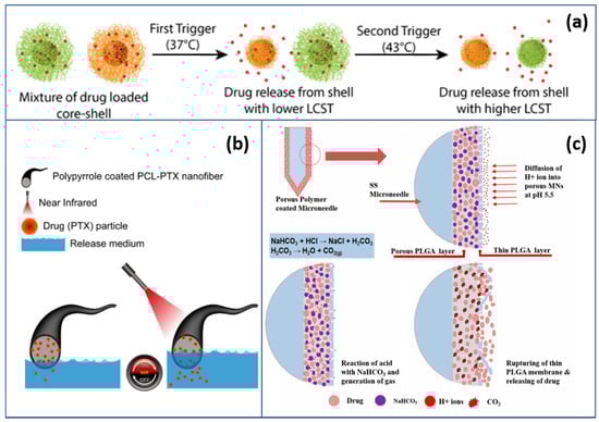 Applications using responsive polymers: (a) schematic representation of the trigger-dependent sustained release of a drug from a mixture of nanoparticles having varying trigger sensitivities [121,122]; (b) schematic illustration of the NIR-triggered drug release from the PPy-coated fiber (Reprinted with permission from Tiwari, A. P.; Hwang, T. I.; Oh, J.-M.; Maharjan, B.; Chun, S.; Kim, B. S.; Joshi, M. K. K.; Park, C. H.; Kim, C. S. pH/NIR-Responsive Polypyrrole-Functionalized Fibrous Localized Drug-Delivery Platform for Synergistic Cancer Therapy. ACS Appl. Mater. Interfaces, 2018, 10(24), 20256–20270. Copyright American Chemical Society) [118]; (c) schematic illustration of the pH-responsive release system [123].
