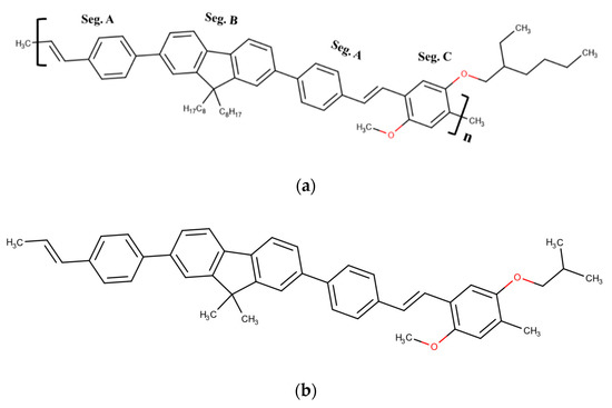 (a) Molecular structure of CP poly[(9,9-dioctylfluorenyl-2,7-diyl)-co-(1,4-diphenylene-vinylene-2-methoxy-5-{2-ethylhexyloxy}-benzene)] (i.e., PFO-co-PPV-MEHB). (b) Tail-truncated molecular structure utilized for the DFT calculation of PFO-co-PPV-MEHB.