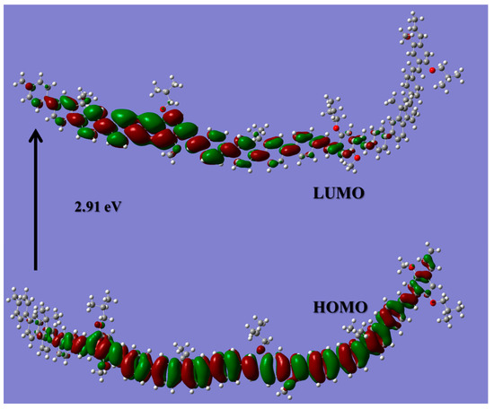 CPs consist of a large number of atoms; hence, the simulation of CPs is considered to be challenging. Thus, many studies have adopted an oligomeric model of the compound [35,36,37]. The absorption spectra and energy gap of the PF-co-MEH-PPV were simulated with three monomer units (n = 3) based on the HOMO-LUMO energy gap calculations. Figure 2 shows the HOMO-LUMO structure of the three-monomer model. The HOMO (Frontier orbital) densities are aligned vertically in the major part of the ring structure; however, the density diminishes in the last monomer at one end (left). The LUMO densities are highly delocalized and align horizontally along the molecular backbone. The LUMO density is higher at the end of the oligomer model where the HOMO density is diminished. The movement of the orbital densities upon excitation significantly improves the optical and electronic properties of the CP. The calculated bandgap is 2.91 eV. The HOMO lies at −6.83 and the LUMO lies at −3.92 eV. In the same manner, the structural and optoelectronic properties of CPs and CO (PCDTBT) have been examined by DFT and TD-DFT [38].