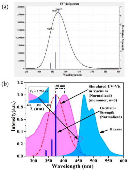 Hexane has a very low dielectric contestant and is a nonpolar solvent; hence, its effect on any molecule (solute) is much less than that of most solvents. Hence, it is optimal for comparison with the results simulated in vacuum. The difference between the simulated and experimental absorption spectra ( is 30 nm, as presented in Figure 3b. This difference could be attributed to the solvent dielectric constant and concentration of the CP in hexane. However, the simulated singlet oscillator strengths matched the peaks and shoulder of the hexane absorption spectra.
