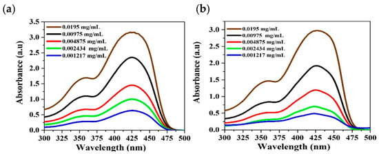 Figure 4 presents the absorption spectra of the CP in toluene and benzene at different concentrations from 195 × 10−4–12.17 × 10−4 mg/mL. It was found that there are three diverse features. The first is a peak at approximately 355 nm and the second is the main peak at 425 nm, with the third being a shoulder at 370 nm. The optical density decreased from a high value to a low value as the concentration decreased. The absorption spectral profile remained the same, and the full width at half maximum (FWHM) of the maximum peak at 425 nm decreased with the decreasing PFO-co-PPV-MEHB concentration. The absorption spectra in benzene are very close to those of PFO-co-PPV-MEHB in toluene. Figure 4b shows the absorption features in benzene.