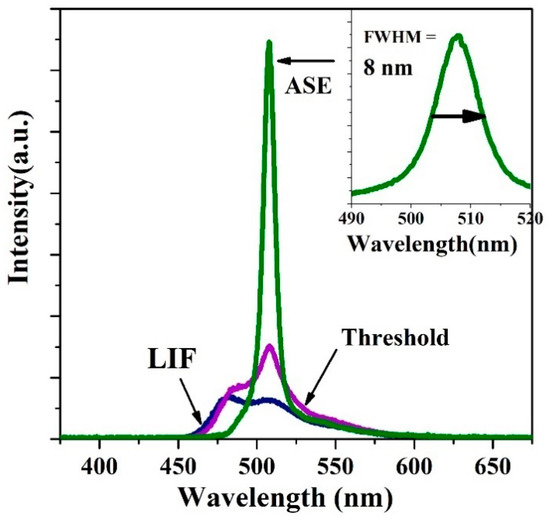 PFO-co-PPV-MEHB in toluene at a concentration of 2.5 mg/mL was transversely excited with a 355 nm Nd: YAG laser. At a minimal pump energy density (3.2 mJ/cm2), the laser-induced fluorescence (LIF) was verified and had two peaks at 507 and 481 nm, as shown in Figure 6. After the pump energy density was increased to 4.5 mJ/cm2, the spectrum became narrower and peaked at 508 nm with an FWHM of 20 nm. When the pump energy density was 7.75 mJ/cm2, ASE was obtained with an FWHM of 8.75 nm and a peak at approximately 508 nm, as presented in Figure 6.