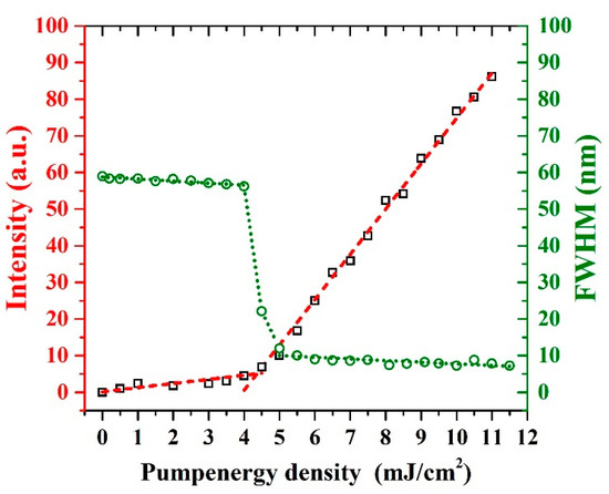 Figure 7 shows the spectral narrowing and increasing of emission intensity of the CP in toluene as a function of the input pump energy density. At 4.5 mJ/cm2, the FWHM of the spectrum reduced from 60 to 8.4 nm and the surge of intensity was linear. A additional rise in the input energy density boosted the output strength, however the spectral bandwidth (nm) of ASE was sustained. The reduction in bandwidth (nm) occurred due the net gain maximization near the vibronic transition peaks of the fluorescence spectrum; so, the spectrum displayed intensity surge as the pump energy density raised.