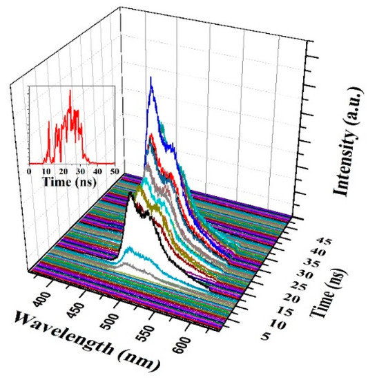 We began the TRS studies with a PFO-co-PPV-MEHB solution at a concentration of 2.5 mg/mL and a pump energy density of 850 µJ/cm2, as shown in Figure 9. The solution produced only laser-induced fluorescence (LIF) of the CP in the three dimensions when the pump energy density was 3.2 mJ/cm2. The CP started fluorescing at 18 ns and maintained this fluorescence until 69.8 ns. The LIF had two peaks at 507 and 481 nm, and the intensity was unstable, fluctuated unsteadily, and reached a maximum value at 48.19 ns.