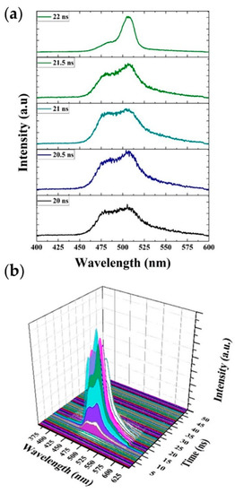 Figure 10a shows a few frames of the spectral profile from 20 ns after the Q-switch trigger. The peak acquired was very broad, with an FWHM of 55 nm. As the photon flux increased, the band at approximately 509 nm gained intensity due to the large stimulated emission and single-pass optical gain. The FWHM was 21 nm at 22 ns. Threshold spectral narrowing occurred in 2 ns. The full profile of the spectral narrowing spectra over time is shown in Figure 10b. We can compare Figure 6 with Figure 10; the former gives the transition from fluorescence to ASE as a function of pump energy, while the TRS study shows that the transition from fluorescence to spectral narrowing and the onset of ASE takes 2.5 ns at the same pump energy.