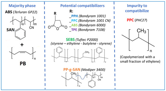 Maleic anhydride (MA) grafting rates were about 1 wt% for every grafted polymer used here. As reported in the introduction, MA-grafted polymers were chosen since this moiety could promote compatibility towards acrylonitrile. More precisely, PP-g-MA grades were chosen because of results found in the literature and as it is a very common compatibilizer for many systems (Maris et al., 2018). PPH and PPC were differentiated in case. PPC, which is less common, could show better compatibility with the minority phase. The TPE used here was an olefinic thermoplastic elastomer with a strong ethylene base. It could show compatibility or even miscibility with polyolefins. It could also act as an impact modifier. Finally, a soft interphase between PP nodules and the matrix could be created. SEBS, here with a weight S/EB ratio of 67/33, can also fulfil these roles, even to a larger extent. This specific ratio was chosen as ABS is the major component. Available SEBS-g-MA grades were all EB rich, so these compatibilizers were not evaluated. Finally, PP-g-SAN appears theoretically to be the optimal polymer for such a system as it could be placed at the interface and bring adhesion.