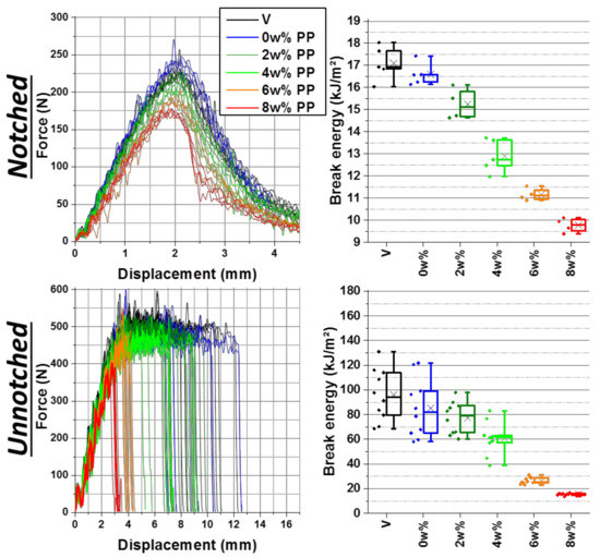Force–displacement curves (left) and break energies boxplots (right) of notched (top) and unnotched (bottom) Charpy impact tests on ABS contaminated at increasing rates of PP —“V” for directly injected ABS, “0 wt%” went through extrusion.