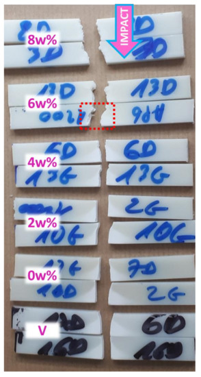 As seen on bottom specimens, the whitening behavior during impact develops at the opposite of the impactor, in the tensile part of the bending test specimen (from the underside to the neutral line), displaying a rather triangular whitened shape. The fracture is rather planar and directly orthogonal to the direction of uniaxial stresses. With PP, the whitening progressively fades, almost invisible at 4 wt%, and is totally nonexistent beyond this, as corroborated by the absence of plateau a (Figure 2). The fracture surface is also getting more and more uneven and more often oblique. Additionally, on several fragments, little spikes protruding from the center of break surfaces can be seen as framed in Figure 3. Beginning at 6wt%, this heterogeneity is even more important at 8 wt%, represented by rods up to 2 mm thick as shown and discussed with SEM characterization in 0.