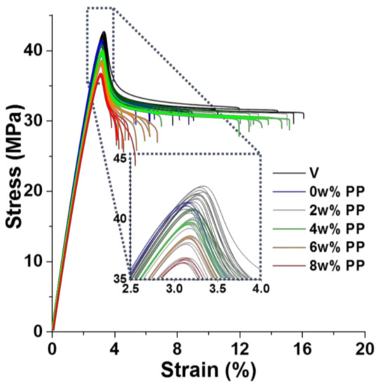 Stress–strain curves of tensile tests on ABS contaminated at increasing rates of PP—magnification on stress peak “V” for directly injected ABS, “0 wt%” went through extrusion.