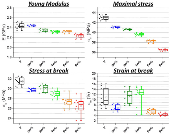 Tensile tests were performed according to the ISO 527 standard and thanks to a Z010 Zwick press equipped with a 2.5 kN load cell and a Clip-on extensometer. All tensile properties were measured at a 10 mm/min crosshead speed. Young’s moduli were determined between 0.05% and 0.25% of deformation. Ultimate strains were measured according to the crosshead displacement.