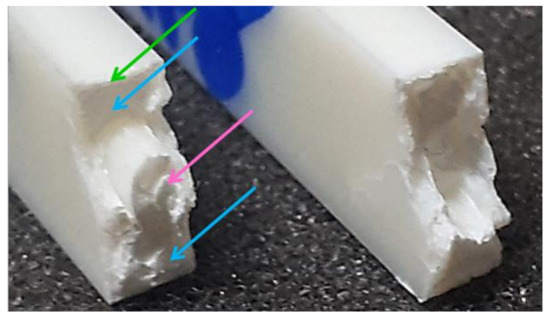 As seen in Figure 3, macroscopic heterogeneity is visible to the naked eye beginning at 6 wt% PP. The phenomenon is even more important at 8 wt% as shown in Figure 7. A central part (pink arrow) was protruding from the fracture surfaces. On some specimens, it is a simple spike as in Figure 3 and on others, it is an ellipsoidal cylinder.