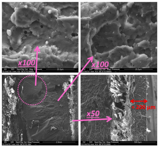 Figure 8 shows SEM pictures on cryofractured samples. The right bottom corner SEM picture represents the sample at a magnification low enough for its full thickness (4 mm) to be visible. Fractures can be seen near the surfaces, magnified on the right-bottom corner, separating “core” from the “skin”. The “core” displays different fracture behaviors and the part indicated in pink seems to result from a more fragile break than the areas around it. Stronger magnifications indicate that nodules could be coarser and more numerous in the central part (top-left picture) than in the rest of the sample (top-right picture). Due to the rough fracture surface due to cryofracture, image analysis could be not performed to corroborate this.