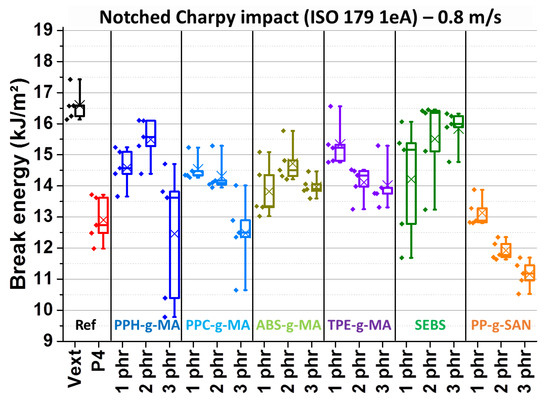 Figure 9 represents the notched Charpy impact on these samples. The first two boxplots correspond to references, virgin but extruded ABS and ABS with a contamination of 4 wt% PP. All compatibilizers led roughly to intermediate properties between these two references at most concentrations, except for PP-g-SAN. This last compatibilizer seems to entail a degradative behavior of PP at 2 and 3 phr. All maleic anhydride compatibilizers present effects similar to each other, around 14.5 kJ/m2. A negative effect of concentration is perceived for all of the g-MA compatibilizers, especially PP-g-MA, homopolymer or copolymer. Even worse, some samples are far below the others in terms of energy. Force–displacement curves (Figures S6 and S7 of supporting information) inspection proves that it is due to a premature break, in a more brittle manner. All these concentration-related negative effects can be explained as the compatibilizer is added in excess and creates another non-dissipating phase, playing the role of a contaminant.