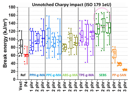 Unnotched Charpy impact break energies—same batches and denominations as previous figure—circle for partial breaks, respectively, 4, 5 and 4 specimens for 1, 2 and 3 phr of SEBS.