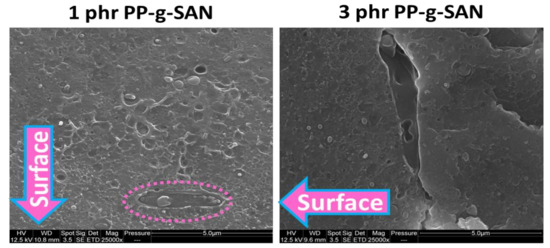 SEM pictures of cryofractured dogbones of ABS contaminated with 4 wt% PP and added with PP-g-SAN at 1 and 3 phr—25,000× magnifications—pictures taken within 100 µm from the surface—arrows indicates surface direction—supposedly PP-g-SAN phase.