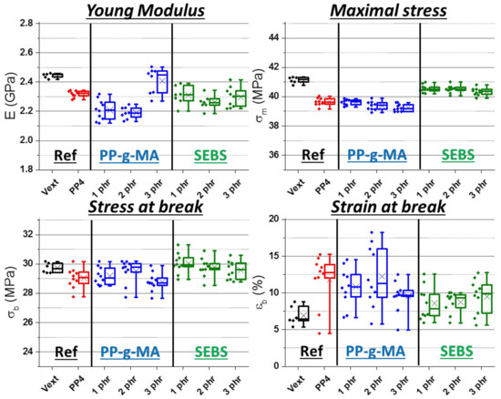 From impact-resistance values and morphology refinement, it was found that PP-g-MA (homopolymer and copolymer undifferentiated) and SEBS are the most promising materials. The second one is more performant but the first one is more common and cheaper. However, tensile properties could be negatively modified, especially by SEBS. They were then assessed for these two additives at different applied concentrations (results in Figure 14 and force–displacement curves in Figure S10 of supporting information). Most batches led to results very similar to references which were already close to each other. Notably, properties do not visibly change with the concentration.