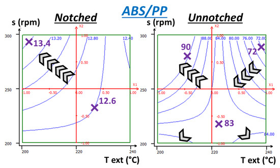 Design of Experiments (DOE) builds and visualizations were carried out using the Nemrodw® 2015 software. Two responses (Y) were considered: mean break energies from notched Charpy impact, and from unnotched Charpy impact. The DOE was applied to an uncompatibilized ABS + 4 wt%PP system, or with SEBS (1, 2 or 3 phr), PP-g-MA (0.5, 1.0 or 1.5 phr) or PP-g-SAN (0.5, 1.0 or 1.5 phr). Twenty experiments were performed, each resulting in 15 Charpy’s impact tests performed on notched and unnotched specimens. A Response Surface Methodology (RSM) was applied to evaluate the influence of several process parameters, extrusion temperature, screw speed and compatibilizer addition rate, on the two responses. The applied interaction mathematical linear model is given in Equation (1):