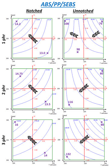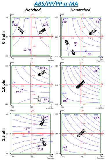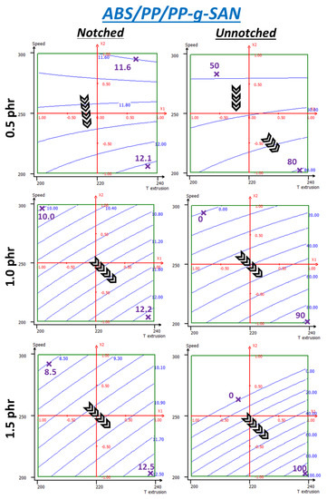 The following results relate a Design of Experiment (DOE) with Response Surface Methodology (RSM) applied to the previous system to evaluate possible influences and interactions with selected compatibilizers from process parameters on impact properties as they are the most sensible properties of this system. As SEBS and PP-g-MA gave the most promising results and PP-g-SAN was found to be poorly incorporated into the matrix, they were selected for this DOE. The purposes were to observe if properties could be further improved for PP-g-MA and SEBS, and if PP-g-SAN could be better incorporated. As easily tunable parameters, extruding temperature and screws rotation speed were chosen as variables. For the sake of simplicity, extrusion temperature was kept homogenous along the screw, except for the feeding zone, kept at 80 °C. Extrusion temperatures and screw speed limits were, respectively, 200 to 240 °C and 200 to 300 rpm. Following previous results, which showed that PP-g-SAN and PP-g-MA were surely added in excess and that the SEBS effect was only marginally dependent on its loading rate, 0.5 to 1.5 phr were chosen for the first ones and 1.0 to 3.0 phr for the last one as DOE limits. Experimental results were used to build the models as averages and standard deviations. Obtained response surfaces are presented below in 2D projections of isoresponse lines. In Figures S16 and S17 of supporting information, response surfaces are given in 3D projections, one figure by impact test type (notched or unnotched), enabling better visualization but forbidding objective interpretation.