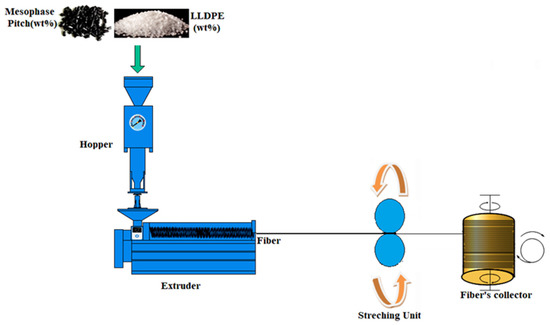 Fibre melt spinning was carried out using a single screw extruder (Noztek Pro Filament Extruder), with a bespoke screw design, swappable barrel, and filament tolerances of 1.75 ± 0.04 mm. The nozzle diameter was 0.5 mm, with a length of 1.5 mm. Pitch/PE pellets were fed into the machine in different ratios to obtain varying proportions of pitch blends. The extruder was operated at 315 °C, at an extrusion speed of 2.5 m/min, and a rotating winder was used for cold stretching as shown in Figure 1. When collecting the fibres, the stretching speed was fixed at 2.5 m/min [28]. The processing steps are shown in Figure 2. The designation of samples with respect to varying proportions of pitch and LLDPE is shown in Table 1.