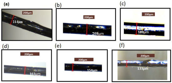 The diameter of fibres in the extrusion process is greatly affected by many factors, such as extrusion speed, the viscosity of the polymers, the diameter of orifice, stretching or drawing ratio, and speed of extrusion. The optical microscope was used to determine the diameter of the cold-drawn samples, and optical microscope images of these with respect to LLDPE content are presented in Figure 3, which shows that different samples produced different fibre diameters, which decreased with an increase in LLDPE content.