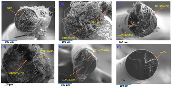 Figure 4 shows the morphology of a range of LLDPE/mesophase pitch blends. The SEM image shows that pitch fibres have a tendency to form microfibrils inside the fibres; Figure 4a [29]. As the LLDPE content is increased, there is a tendency for microfibre formation inside the blend fibres to reduce; see Figure 4b–e. Post adding of LLDPE with pitch, a decrease in the cluster formation and low alignment is observed in the mesophase pitch. The pure/neat LLDPE fibre does not show any microfibrous pitch (silver), only LLDPE (black solid). Therefore, we can conclude that the relative content of LLDPE has a very significant effect on fibre morphology and diameter. In mesophase pitch fibre fabrication, the molten liquid crystalline mesophase can be oriented within the die by shear treatment during a soften-spinning process. Overall, the shear forces involved lead to a strongly oriented structure, with the mesophase domains elongated in cylinders parallel to the axis of the fibres (circumferential fibres). The microstructural study suggests that the radial orientation of the fibres obtained from the mesophase pitch originates from the flow to throw across the die [30]. The spinning stage is the most important stage in the manufacture of mesophase pitch blend LLDPE, to control the shape, transverse texture and orientation of the fibre, which results in higher performance.