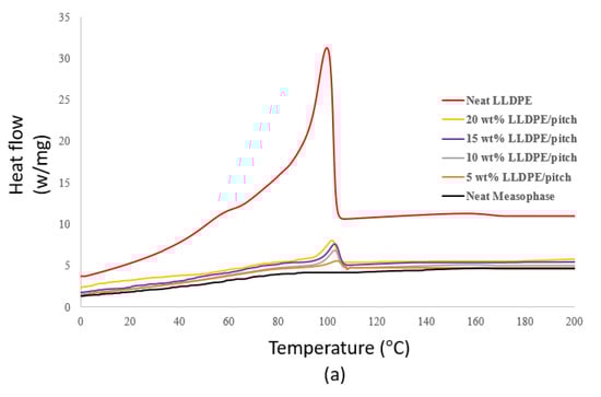 Similarly, the melting temperature and enthalpy of fusion of the samples change with the proportion of LLDPE in the LLDPE/mesophase pitch blend, see Figure 6b, and Table 4. The melting temperature increases with the proportion of LLDPE in the blend, so that the maximum melting temperature is for pure LLDPE. The enthalpy of fusion (∆Hm, the area under the endotherm) is highest for pure LLDPE; this is due to the absence of crystalline domains in pure LLDPE compared to LLDPE/mesophase pitch blends. We see that the presence of LLDPE in LLDPE/mesophase pitch blends affects the melting and crystallization behaviour of the blends.