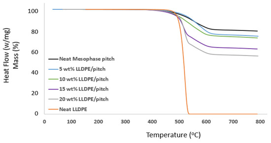 The TGA was carried out in the temperature range of 100 to 800 °C. The thermal degradation of neat LLDPE and different wt% LLDPE/mesophase pitch fibres was studied, and typical thermal stability curves are shown in Figure 7 for a range of mixes from neat mesophase pitch to neat LLDPE.