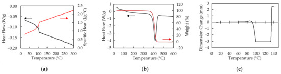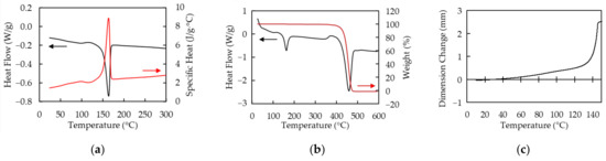 The thermal characteristics of polypropylene (PP) are shown. All measurements are performed under nitrogen atmosphere. (a) Heat flow (black line) and specific heat (red line) measured by differential scanning calorimetry (DSC); (b) Heat flow (black line) and weight (red line) measured by simultaneous DSC and thermogravimetric analysis (SDT) under nitrogen atmosphere; (c) Dimensional change measured by thermal–mechanical analysis (TMA). Static pull force of 0.1 N is applied to a sample.