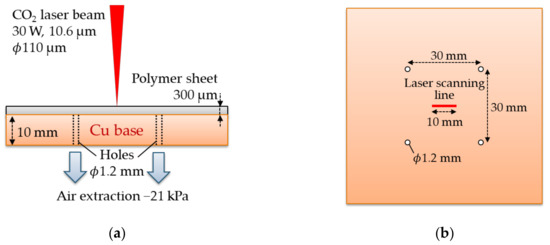 The Schematic diagram of the Cu cooling base is shown in Figure 3. The Cu plate with the thickness of 10 mm has four holes with a diameter of 1.2 mm. The polymer sheets are pressed to the base by extracting the air inside the gap between the sheet and the base through the four holes. The negative pressure is around 21 kPa.