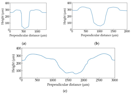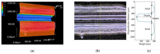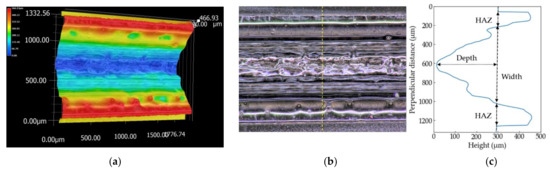 Figure 7 shows the height profiles of the PP samples at (a) Ev = 3.8 × 1010 J/m3, (b) Ev = 9.5 × 1010 J/m3, (c) Ev = 38 × 1010 J/m3. The sample at Ev = 3.8 × 1010 J/m3 is sharply processed. The higher the laser energy is, the wider width and HAZ become.