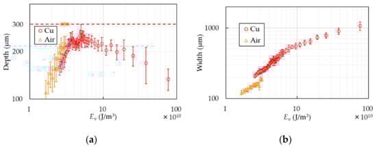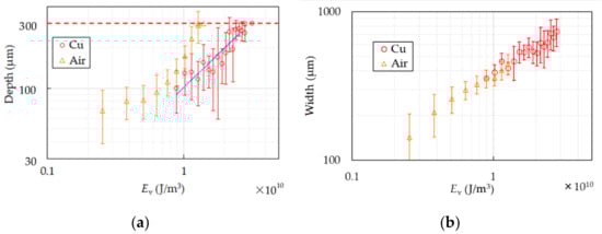 Figure 6 shows the depth and width of the PP samples with or without the Cu base. The horizontal axes are standardized to represent energy per unit volume, Ev = P/(S·A), where A is the focused area of the laser beam. In the case of air, the depth increases as Ev does up to ~2.5 × 1010 J/m3. Excessing the energy, the samples are partially penetrated without becoming thinner than 100 µm, which is the reason why there are two marks at the same Ev in Figure 6a. Finally, they are completely cut over Ev ~ 3.3 × 1010 J/m3. It indicates that it is quite difficult to make PP sheets thinner than the thickness of 100 µm with the conventional method. In the case of the Cu base, though the depth is a little shallower than that of air at the same laser condition, the samples are not cut even if Ev excesses the energy that the samples processed without the base are entirely cut. Increase of the depth stops at the value of around 250 µm at Ev ~ 3.3 × 1010 J/m3. The PP sheets are processed stably to around 250 µm in thickness up to Ev = 10 × 1010 J/m3. The error of the constant thin-film processing is ±20 µm. The depth starts decreasing over 10 × 1010 J/m3. The width becomes wider as the energy increases in both cases. The width in the case of the Cu base is wider than that of air. The blue dot-line in Figure 6a represents a linear approximation to the results of the Cu base in the range of the monotonic increase. The approximate equation, which is estimated by the method of least squares, is where D is depth. The ablation threshold is found to be 4.7 kJ/g by using the PP density of 0.9 g/cm3 [21], which is comparable with that of other polymers [27,28].