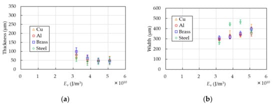 Figure 8 shows the depth and width of the PS samples with or without the Cu base. In the air case the thinner the samples become, the deeper the depth gets. The samples start penetrating partially and totally cut at Ev ~ 3.3 × 1010 J/m3. In the case of the Cu base, the depth increases as the energy does and the samples are totally cut after partial penetration as well as in the air case. The increasing ratio of the widths in both cases are the same at the same Ev unlike PP.