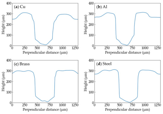The height profiles of the grooves processed with each metal at Ev = 5.1 × 1010 J/m3 are shown in Figure 10. There is no great difference in shape among the metals.