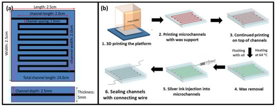 (a) Schematic depicting design and dimensions of microchannels. (b) Complete fabrication process of printed strain sensor. Reproduced with the permission of Reference [12]. Copyright 2017 Elsevier.