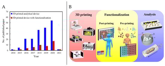 (A) Research interest in 3D-printed analytical devices and 3D-printed devices with functionalization. (B) Advances in functionalization of 3DP components for sensors and analysis. Reproduced with the permission of Reference [11]. Copyright 2017 Elsevier.