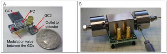 (A) Prototype of the microPC-microGCxGC subsystem. (B) Prototype of the mini-PDID. Reproduced with the permission of Reference [20]. Copyright Sandia National Labs.