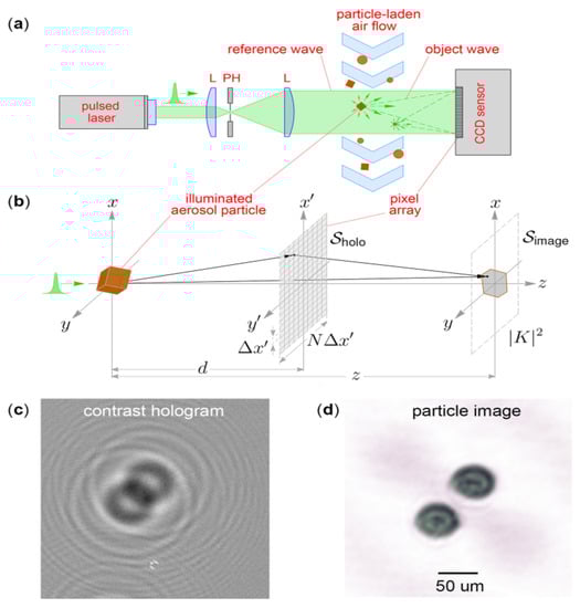 Basic operational principle of digital holographic imaging of aerosol particles. (a) A pulsed, expanded laser beam illuminates free-flowing aerosol particles and a CCD sensor records the interference pattern produced by unscattered and particle-scattered light. (b) Diagram of the image reconstruction process where the hologram is envisioned as a transmission diffraction grating in the plane Sholo that produces an image |K|2 in the plane Simage through application of diffraction theory. (c,d) Example of a contrast hologram Icon for an aerosol of spherical particles and the particle image obtained from it. Reproduced with the permission of Reference [22]. Copyright Springer.