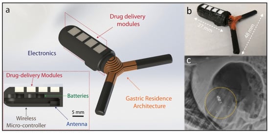 (a) 3D models of GRE device components, such as the gastric resident architecture, personalized drug delivery modules, electronics and power system for communications and control. (b) Optical photograph of the 3D-printed GRE. (c) X-ray image of the deployed GRE in a porcine stomach. Reproduced with the permission of Reference [24]. Copyright National Science Foundation.