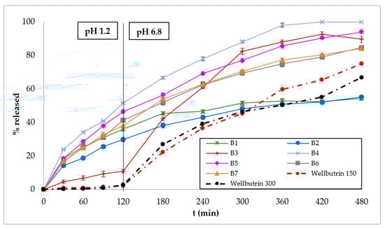 The kinetics release data, obtained via the Korsmeyer–Peppas equation (Table 2), revealed that the release of BUP·HCl, from the formulations tested, followed in most cases (B4 (n = 0.61), B5 (n = 0.61), B6 (n = 0.66), B7 (n = 0.67) Wellbutrin® XR 150 mg (n = 0.51) and Wellbutrin® XR 300 mg (n = 0.75)), a non-Fickian pattern (0.45 < n < 0.89, anomalous diffusion), i.e., a combined mechanism of pure diffusion and Case II transport [55].