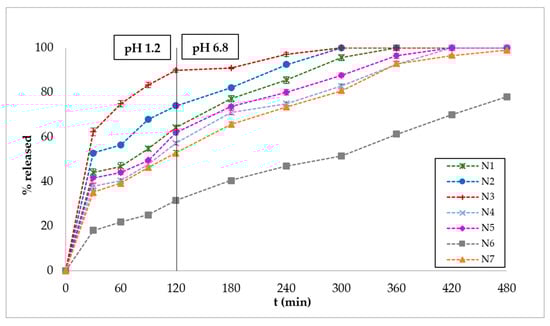 The dissolution curves of NTX·HCl (N1-N7) from the matrix tablets at both pHs (1.2 and 6.8) are depicted in Figure 3. In detail, the % release of NTX·HCl from formulation N6, which contained PEO (95%), was lower (77.90%) than that from formulation N3 (100%), involving Eudragit® L100-55 (95%), at both pHs, 1.2 and 6.8. This finding, which was the opposite of the that noticed in the respective formulation of BUP·HCl, could be attributed to the fact that BUP·HCl, albeit being a much more water-soluble compound (solubility: 312 mg/mL) [5,56] than NTX·HCl (solubility: 100 mg/mL) [57], was used in a much higher quantity (37.5%), in all formulations tested, than NTX·HCl (4%). The same trend was noticed and at pH 6.8. This was expected, as the much higher quantity of Eudragit® L100-55 in all NTX·HCl formulations, lead to an enhancement of its release, because in the formulation N3, which involved the pH dependent, water soluble polymer, Eudragit® L100-55, a facile water penetration into the tablet was permitted and consequently the hydration of the formulation system, leading to a sustained drug dissolution profile [58].