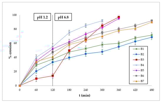 % Erosion of BUP·HCl tablets formulations vs. time at pH 1.2 (0–120 min) and at pH 6.8 (120–480 min). The results denote the mean value (n = 6).