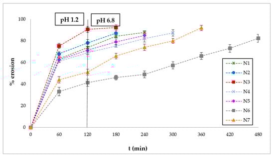% Erosion of NTX·HCl tablets formulations vs. time at pH 1.2 (0–120 min) and at pH 6.8 (120–480 min). The results denote the mean value (n = 6).