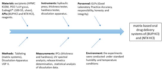 The choice of excipients is based in several drug release and erosion studies that have shown a well-functionality and efficacious properties of the used polymers. These polymer-based drug delivery systems appeared to be depended by diffusion or erosion mechanisms, solvent activation (swelling or osmotically controlled) or stimulated by external factors (e.g., pH, temperature or sink conditions) [11,19,78] Moreover, an Ishikawa diagram or a “cause and effect diagram” (Figure 7), depicts concisely a lab scale manufacturing process, showing the most crucial factors and parameters, which contribute in the initial design and development of sustained release rate matrix-based oral drug delivery systems of BUP·HCl and NTX·HCl. Parameters such as materials, methods, instruments, measurements, personnel and environment are considered significant for the formulation process optimization [79].