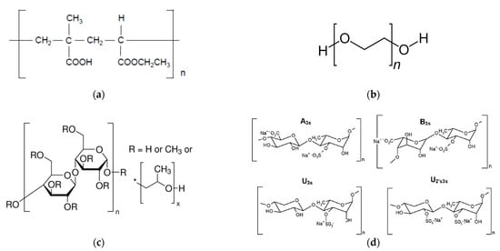 Chemical structure of: (a) Eudragit® L100-55, (b) poly(ethylene oxide) (PEO), (c) hydroxypropylmethycellulose (HPMC K15M) and (d) structure of the main repeating disaccharides in Ulva ulvan: ulvanobiuronic acids A3S and B3S and ulvanobioses U3S and U2′S,3S [29].