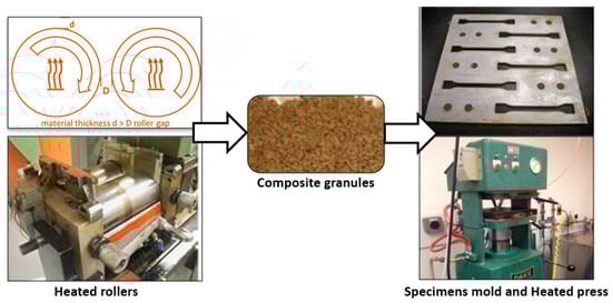 Strips of composite material were molded into dog-bone shaped specimens (ISO 527-2:2012 Type 1A) for tensile strength testing (Figure 1) [38] and into rectangular shape for the three-point flexural test ASTM D790-10 [39]. A DAKE press was used (Figure 1). The metal plates were heated on both sides at 170 (±2) °C. The pressure was maintained at 5 MPa for 10 min (although fiber degradation begins around 250 °C, applying 5 MPa of pressure for a long time causes fiber degradation). The mold was then cooled to below 60 °C by circulating cold water in the plates. The dimensions of the specimens were 10 mm wide and 4 mm thick for the tensile test and 12.2 mm wide and 3.1 mm thick for the flexural text. The production process is shown schematically in Figure 1. All specimens were polished, and then kept overnight in the testing room. The width and thickness were measured with a micrometer.