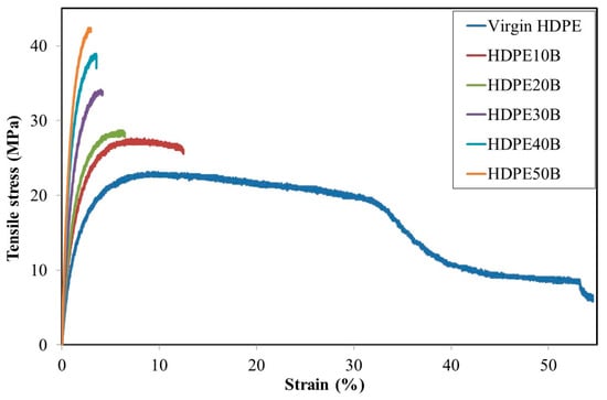 Tensile test: stress–strain behavior of HDPE/birch fiber composites.